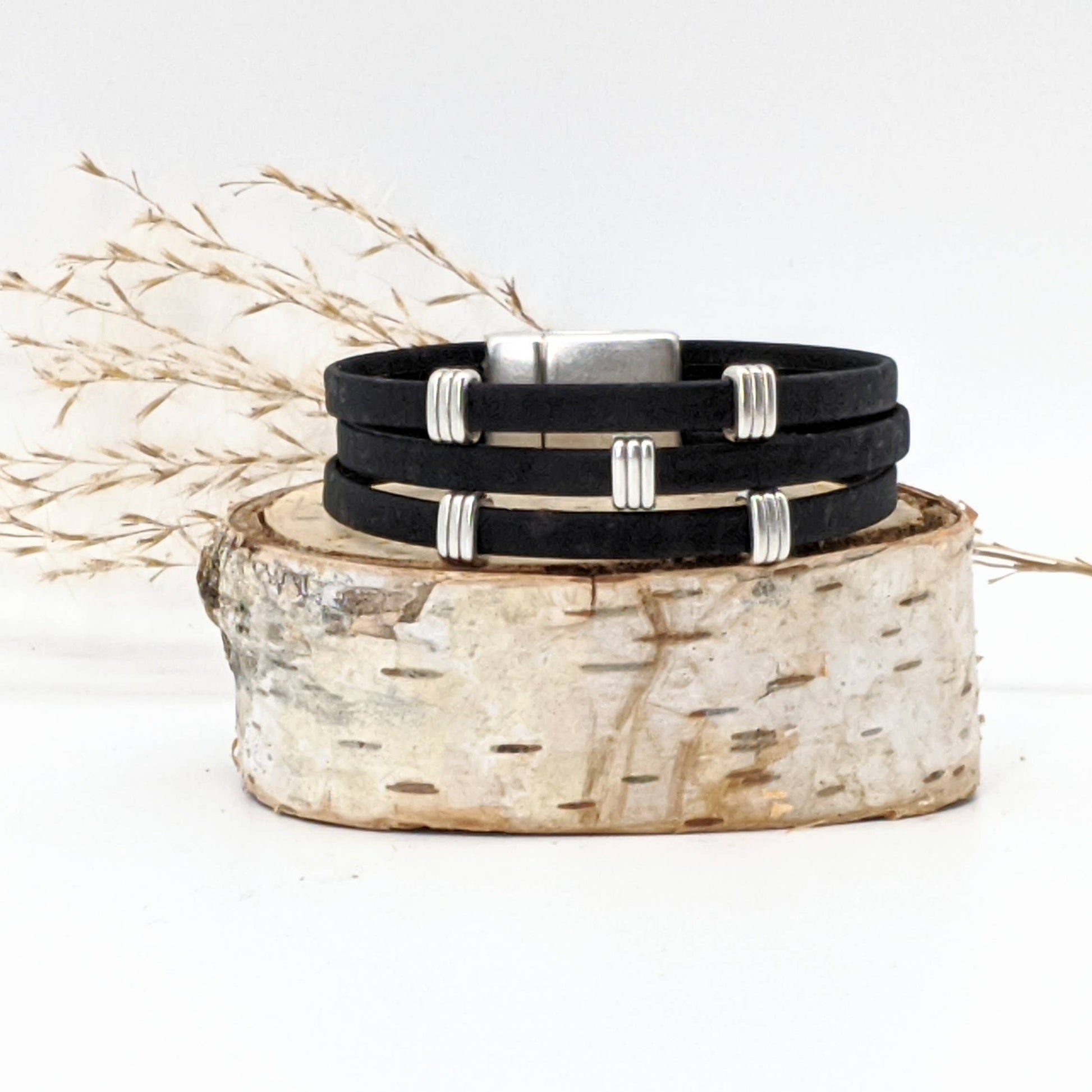 Three strands of Portuguese Cork Bracelet with antique silver accents and magnetic clasp (15mm wide) create a bold statement piece. Available in three sizes: Small: 6 1/2” finished length, Medium: 7” finished length, Large: 7 1/2” finished length. Cork is used as a vegan substitute for leather in a wide range of products including jewelry. Cork is a natural material, therefore each item will be unique. Colors include: Black, Natural, Seafoam, Blue, Navy, Grey