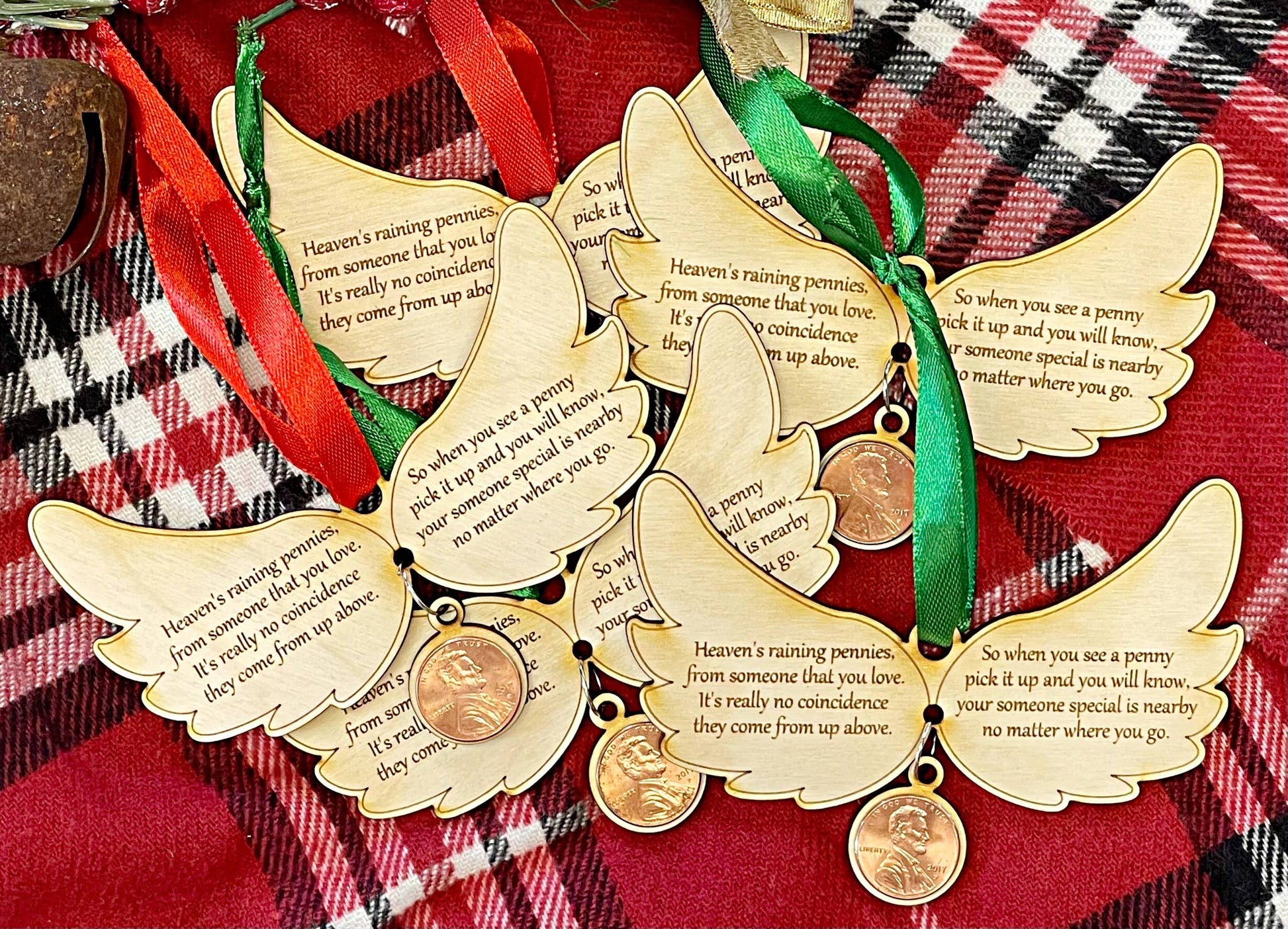 Have you ever heard the saying that when you find a penny, it's a sign from Heaven? This gorgeous laser engraved wood ornament features a lovely poem and a space to glue on your favorite "found" penny. Ornaments come with either red or green ribbon and a hanging wood disk. The pennies do not come with the ornaments because most people like to add a penny with the year of their choosing. To adhere the penny, all you need is some wood glue or e6000 glue.
